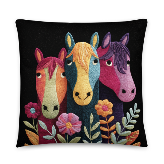 Throw Pillow - Colorful Three Horses and flowers - Boho Decor