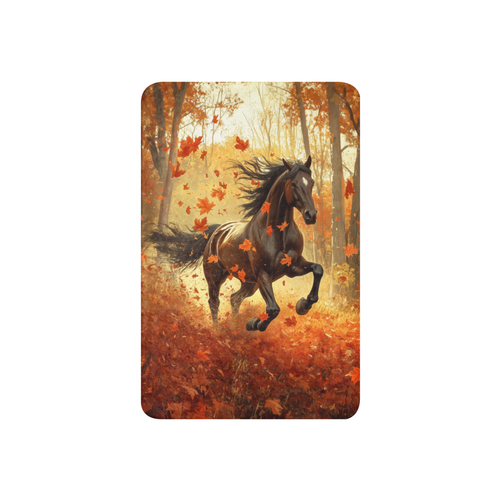 This captivating artwork portrays a powerful black horse galloping through an autumn forest. The scene is vibrant with swirling red and orange leaves, creating an enchanting atmosphere. The use of light and shadow adds depth and dynamism to the piece, drawing viewers into the movement and energy of the horse and the surrounding nature. This piece is perfect for nature lovers and equestrian enthusiasts, bringing a sense of freedom and beauty to any space.