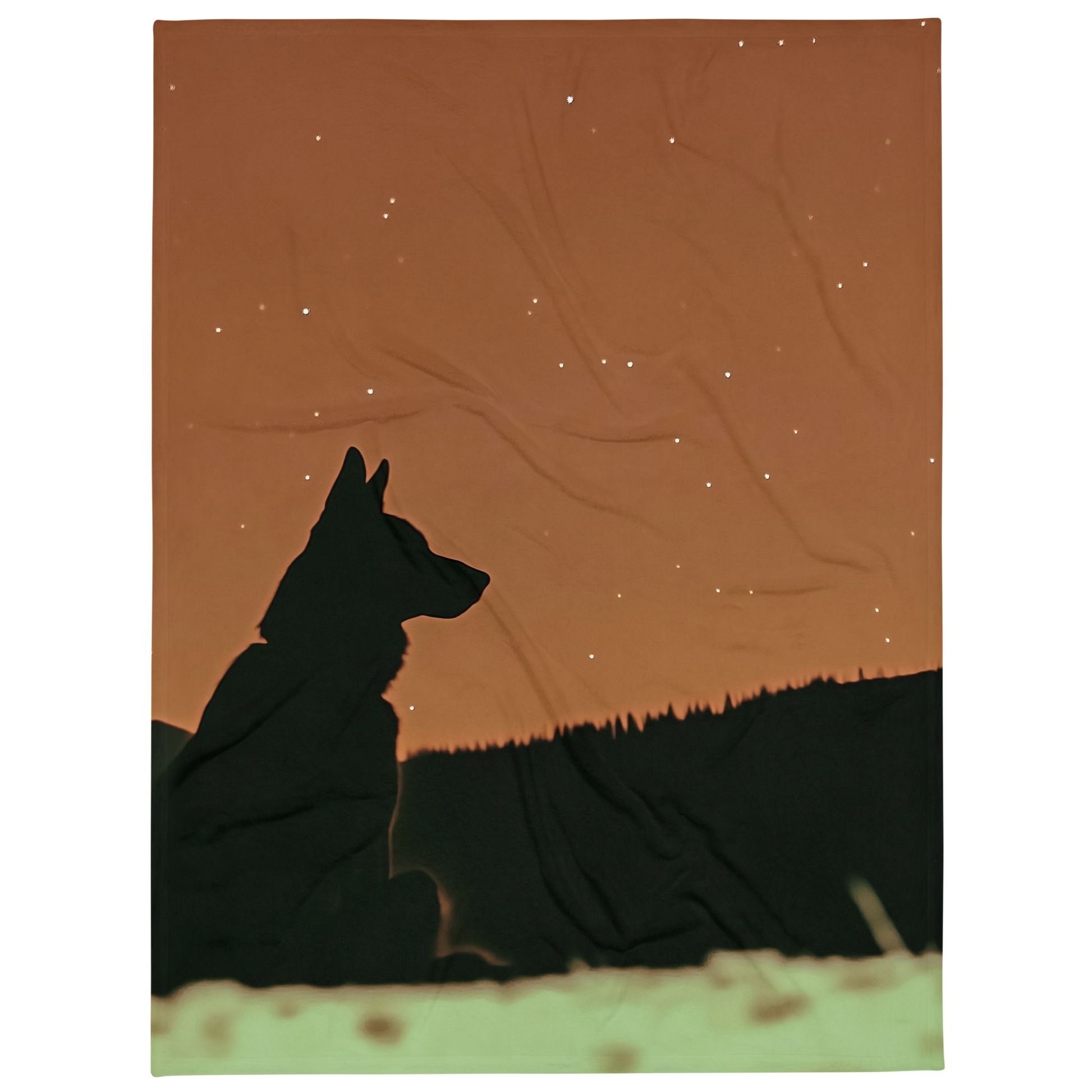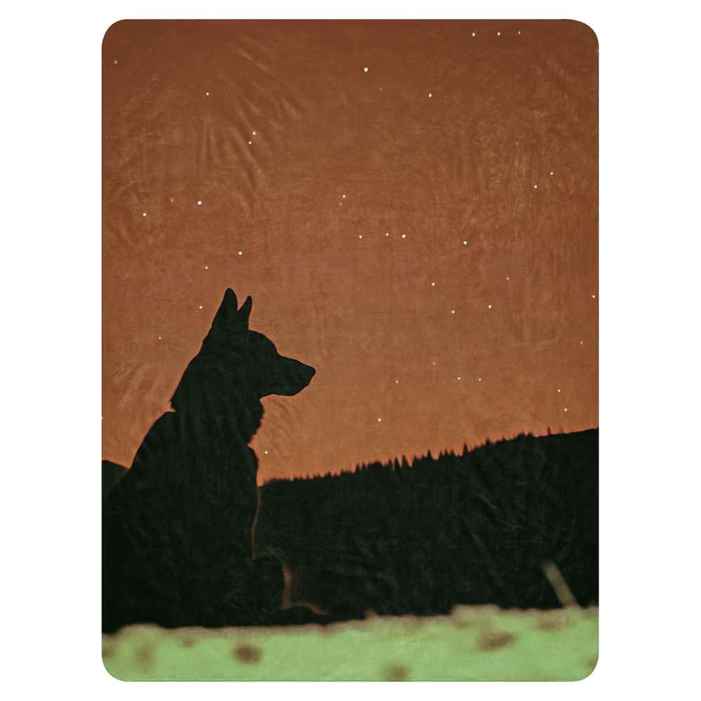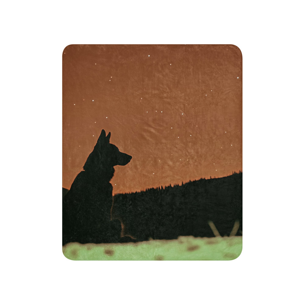 Experience the beauty of the night sky with our German Shepherd Blanket featuring a silhouette of a German Shepherd gazing at the stars. Perfect for dog lovers and stargazers alike.