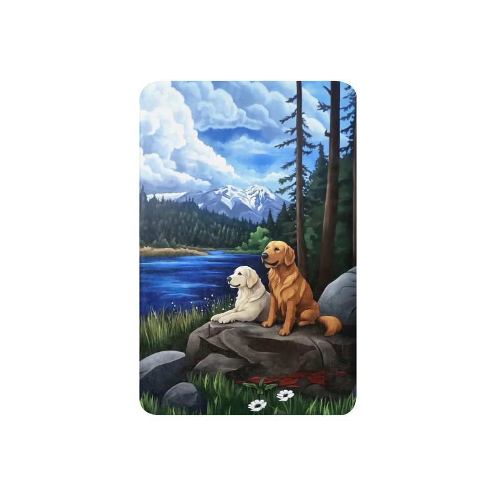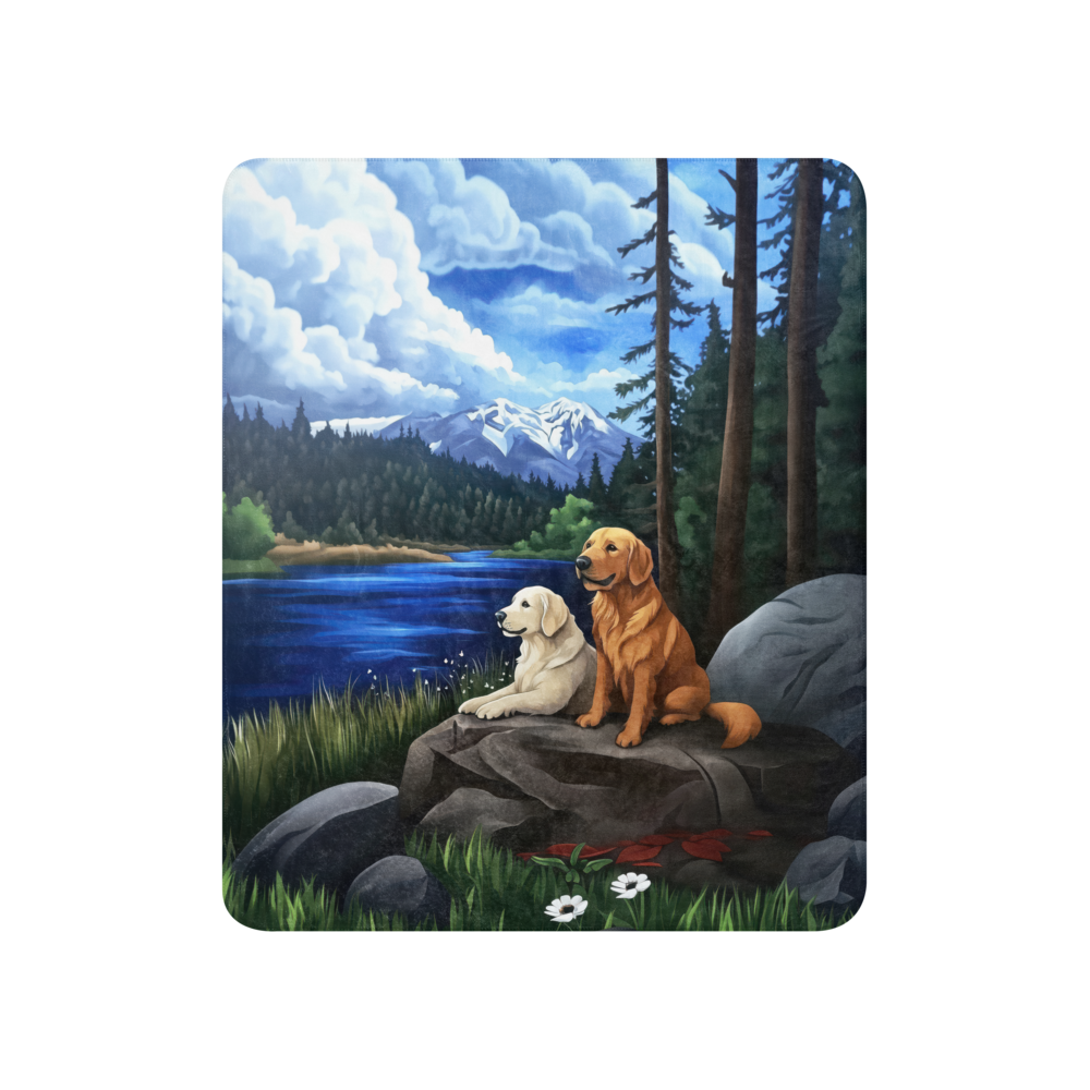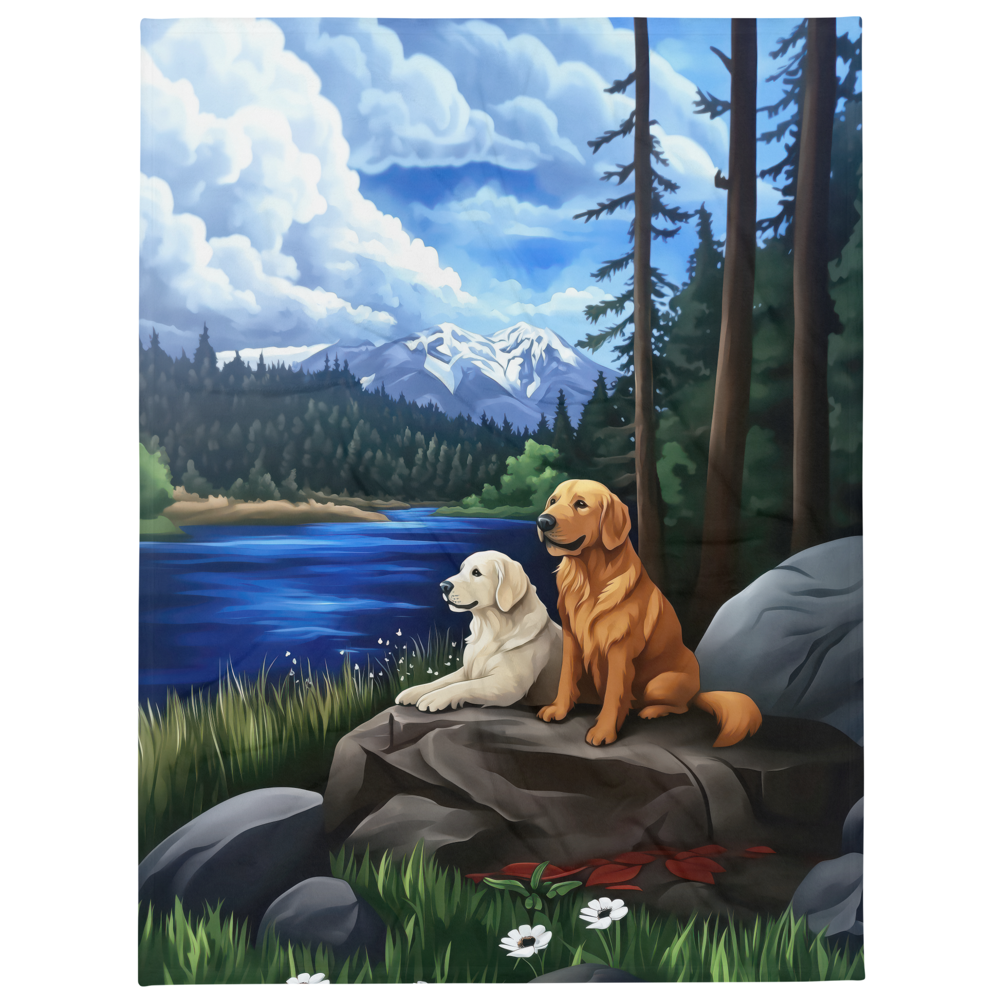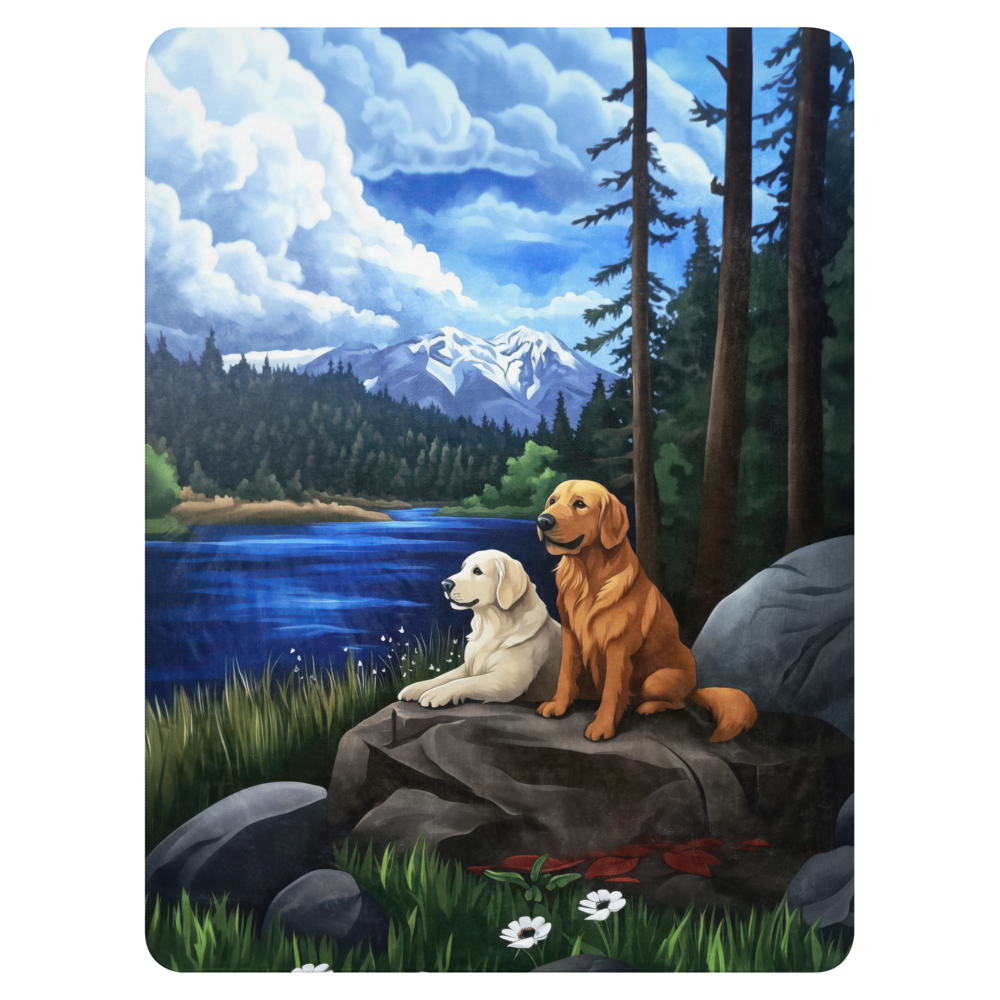 Experience the warmth and comfort of our blanket featuring two Golden Retriever sitting on large rocks by a blue lake in a forest with green grass near tall pine trees with snow-capped mountains in the background. Perfect for dog art lovers and enthusiasts. Made with high-quality materials for a cozy and stylish addition to your home decor.