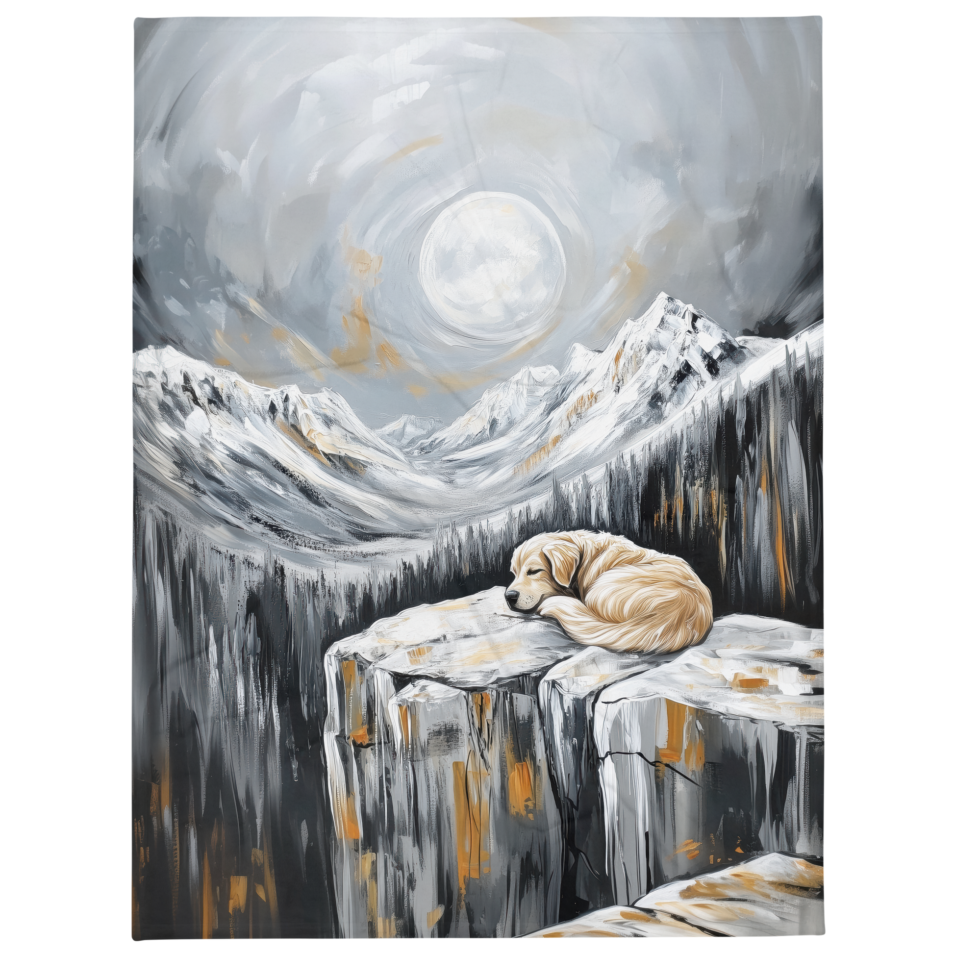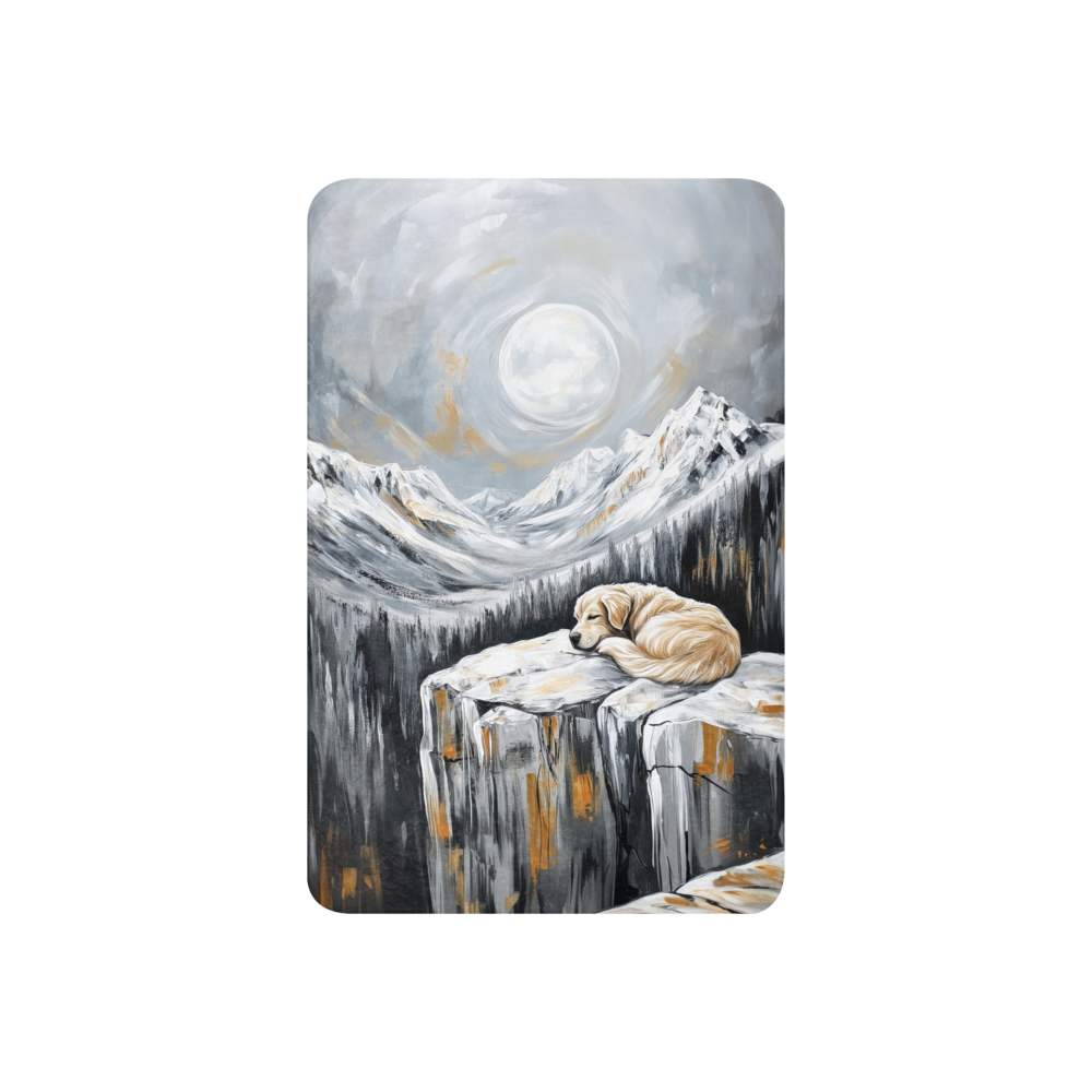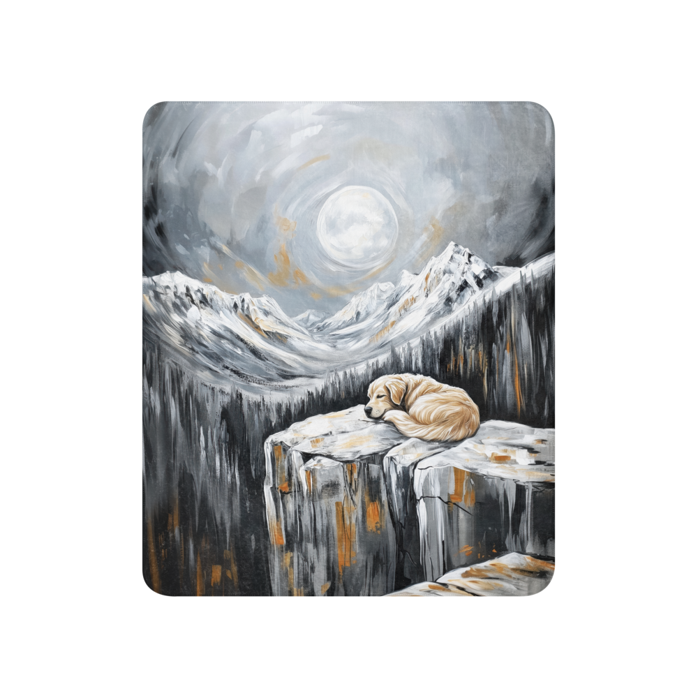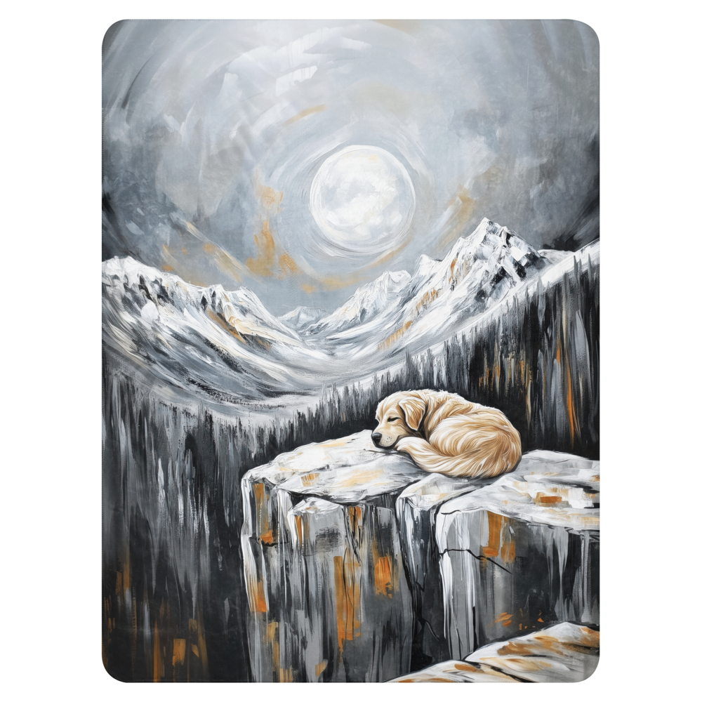 Experience the warmth and comfort of our blanket featuring a Golden Retriever sleeping on the edge of a cliff, with snowy mountains in the background and a full moon shining through the clouds. The painting is in shades of gray and white with gold accents. Perfect for dog art lovers and enthusiasts. Made with high-quality materials for a cozy and stylish addition to your home decor.