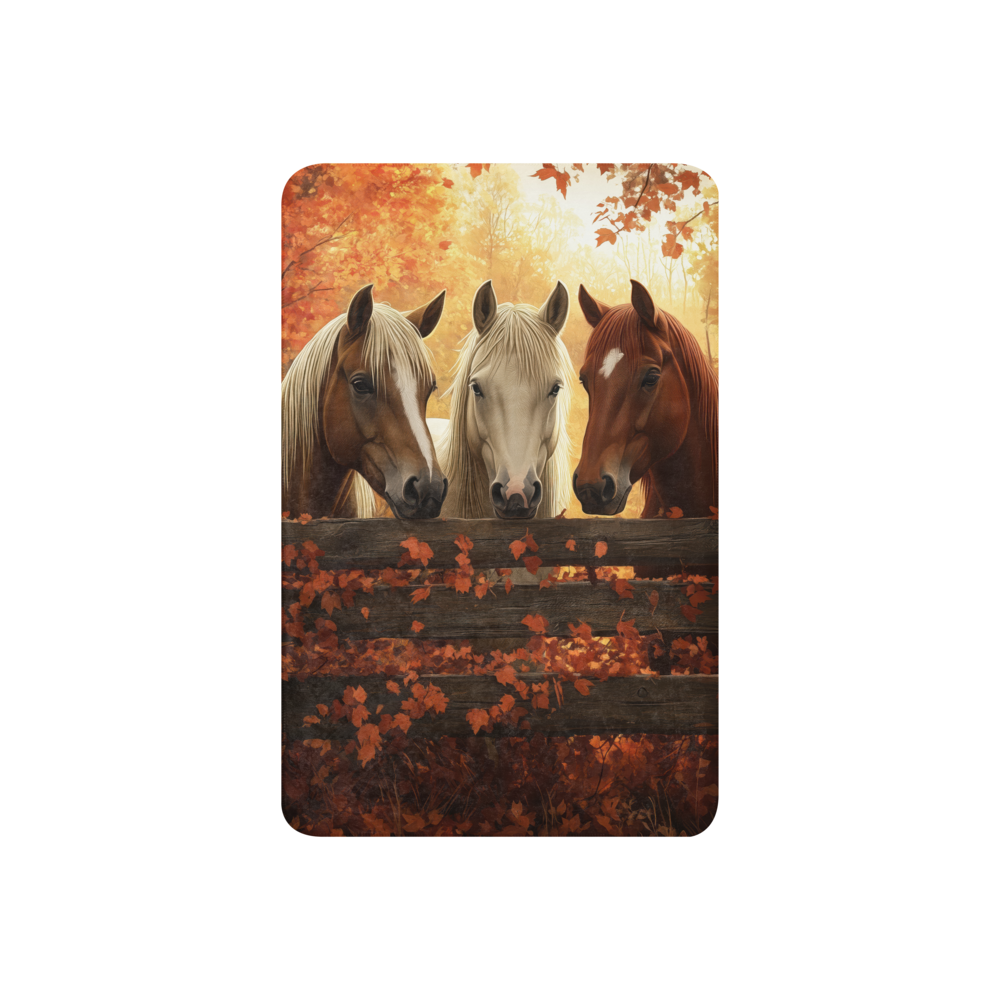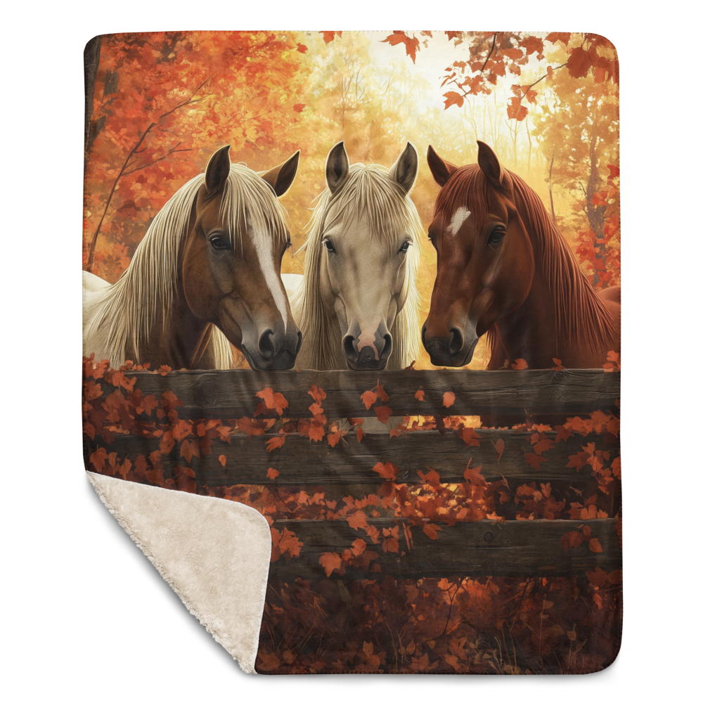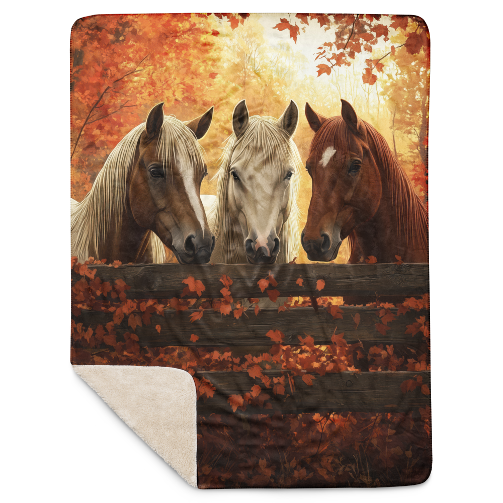 Transform your space with this stunning blanket featuring three elegant horses standing behind a rustic wooden fence amid brilliant autumn foliage. The scene captures a serene moment, enveloped in rich colors of amber and gold, highlighting the grace and natural beauty of these majestic animals. The harmonious blend of colors creates a calming and captivating image, drawing the viewer into a tranquil autumnal world. Perfect for animal lovers and those enchanted by the beauty of the fall season.