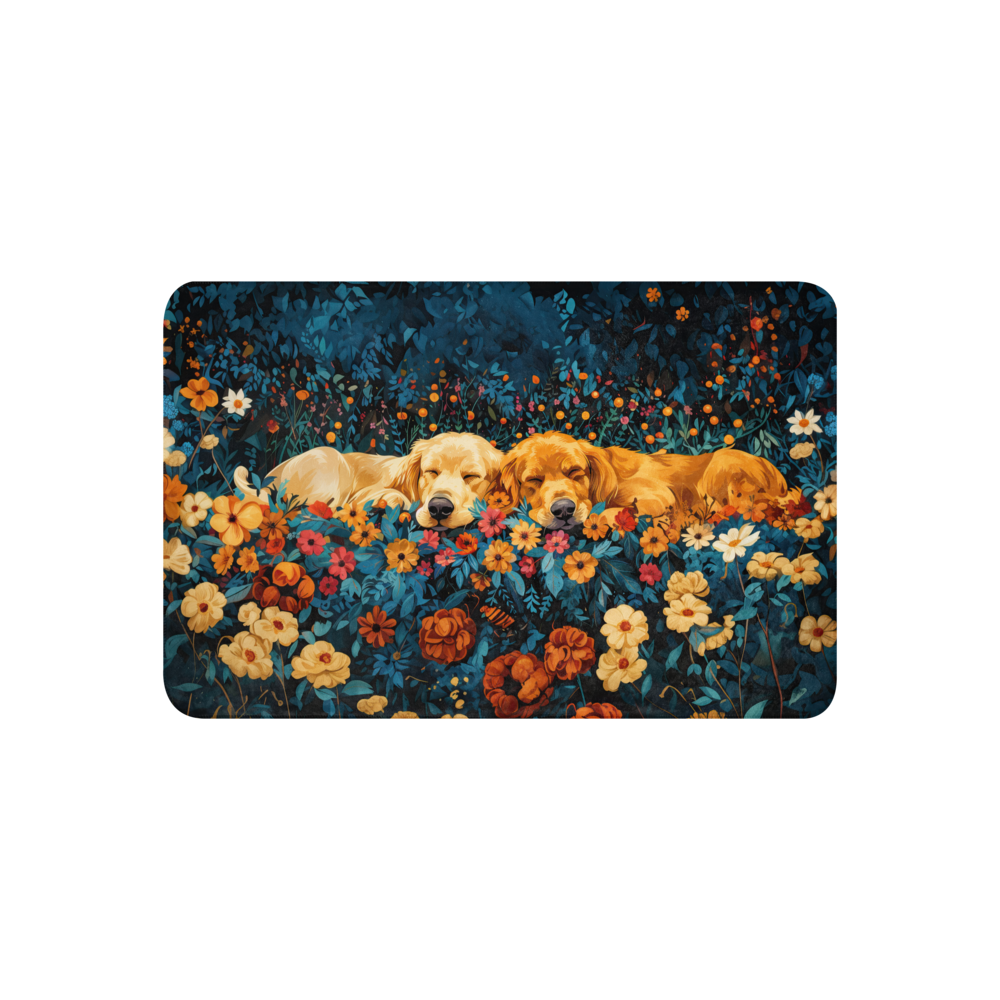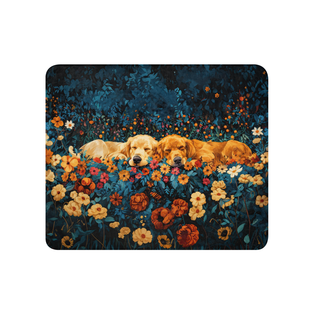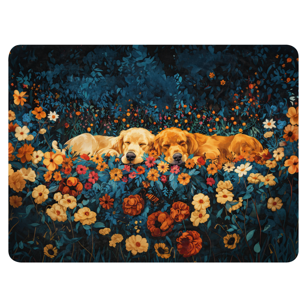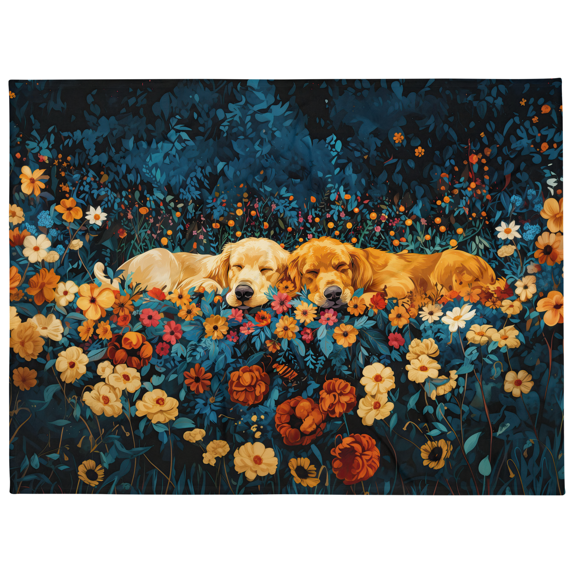 Experience the joy of cuddling up with your furry friend on this blanket featuring a tranquil scene of two Golden Retrievers cuddling amidst a field of flowers, portrayed in an illustration with vibrant colors and a dark blue backdrop, reminiscent of oil painting. Perfect for dog lovers and owners.