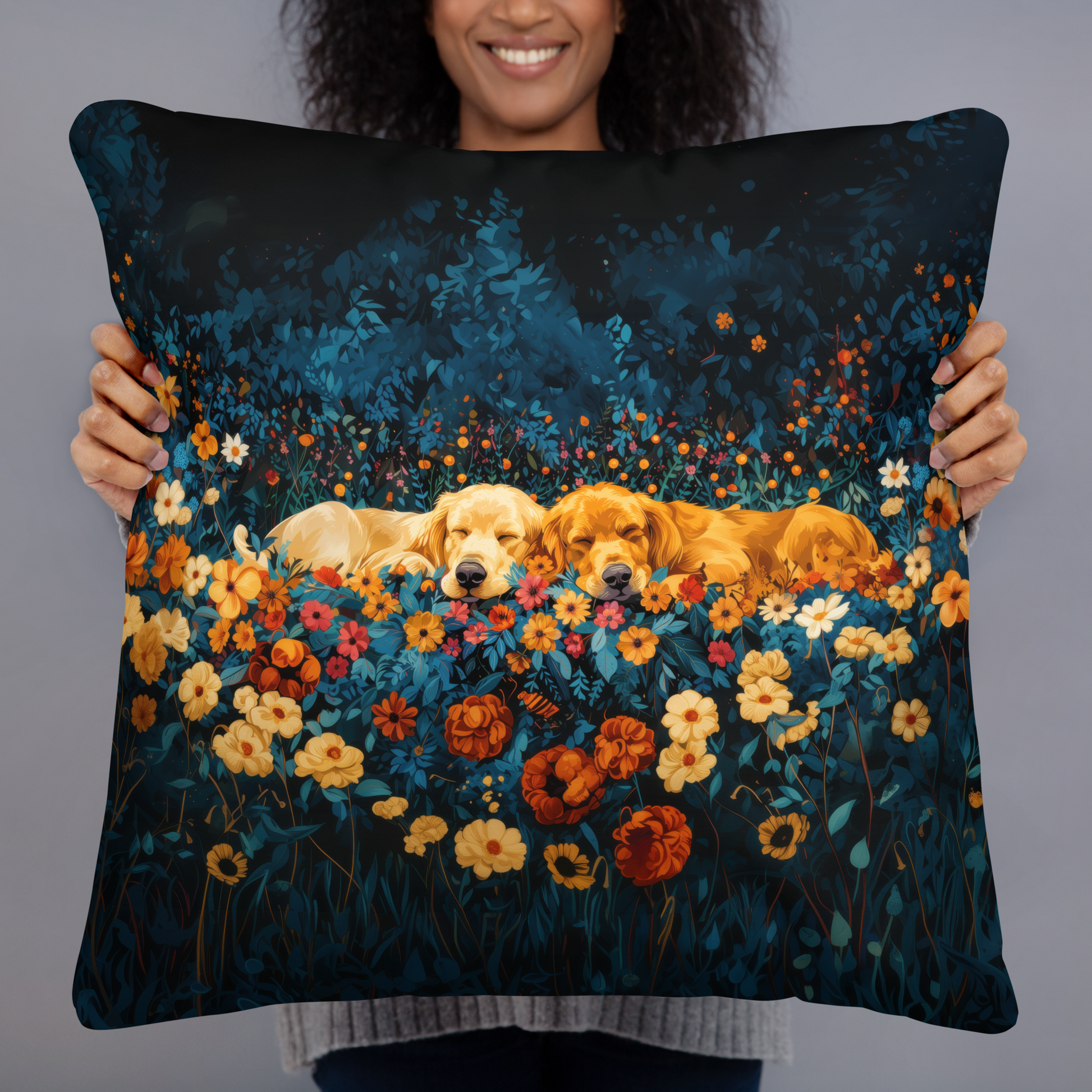 Throw Pillow - Golden Retrievers Cuddling amidst a field of flowers